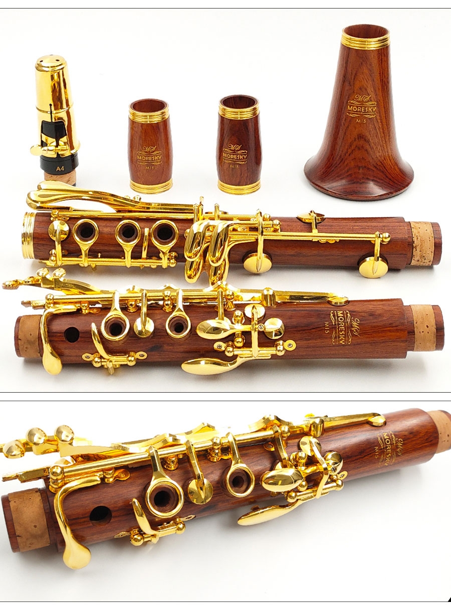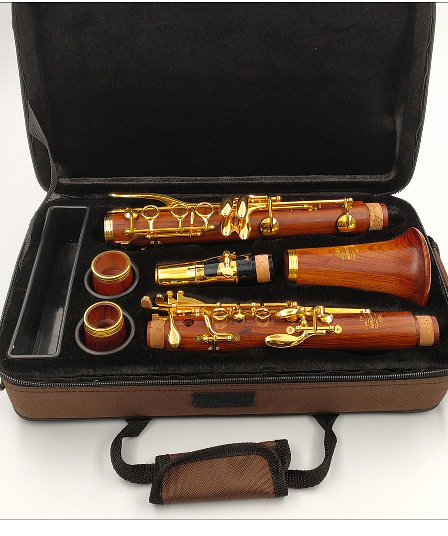 Clarinete Sib madeira Jacarandá, com 17 chaves banhadas à ouro.